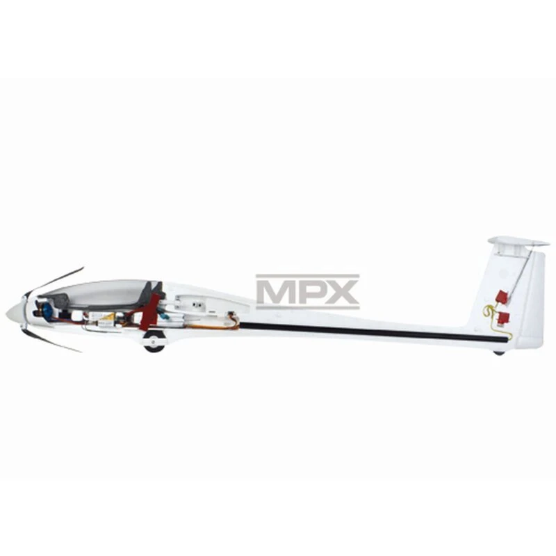 ELAPOR®-Formteile für Rumpf, Flächen mit eingeschäumten und GFK-verstärkten Alu-Holmrohren, Leitwerk, Haubenrahmen und Seglernase, sowie Klarsichtkabinenhaube und GFK-Gurte. Alle zur Montage erforderlichen Kunststoff- Klein- und Anlenkungsteile, gestanzter Dekorbogen und ausführliche Anleitung.