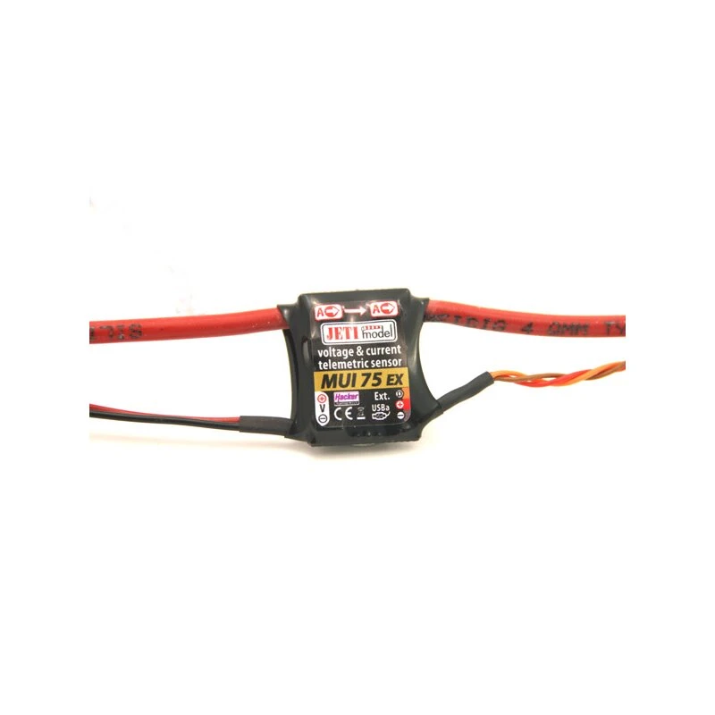 Die Telemtriesensoren „MUI“ ermöglichen das Messen von Spannung, Strom und verbrauchte Akkukapazität des Antriebsakkus. Zur Anzeige der gemessenen Werte wird ein JETI Sender oder die an einem TU2 Modul angeschlossene JETI Box genutzt.