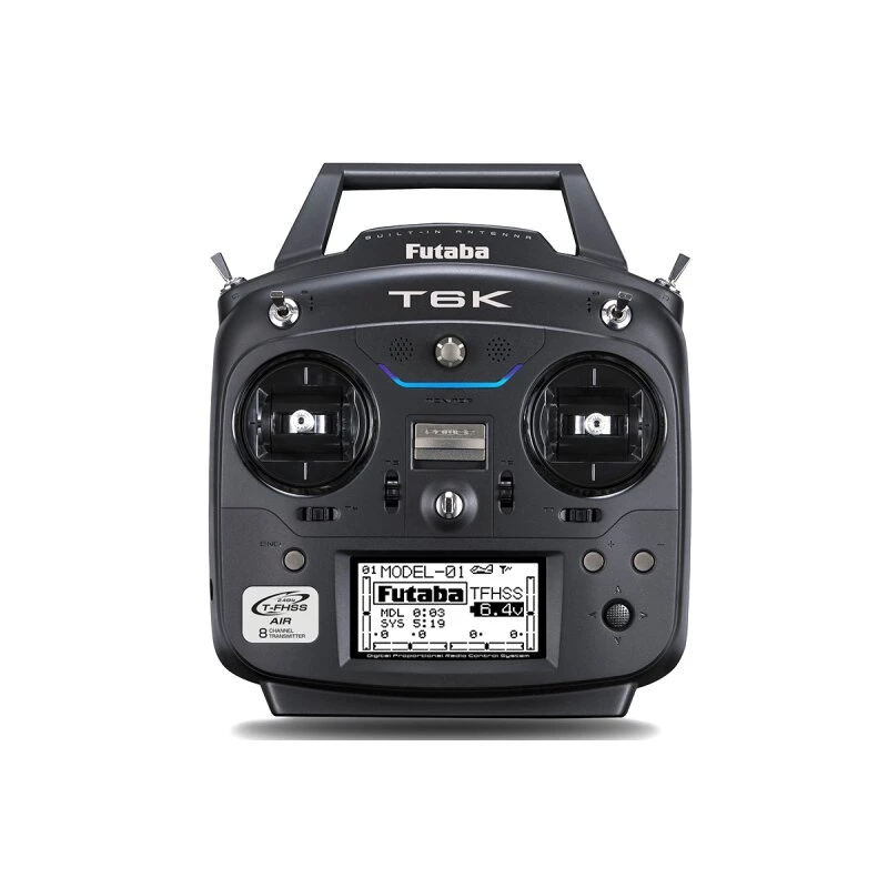 NEU! Durch das Software-Update auf Version 2.x wird die T6K um 2 Kanäle erweitert – somit ist die T6K ab sofort eine vollwertige 8-Kanal-Fernsteuerung. Das System verfügt über umfangreiche Telemetrie-Funktionen und die bidirektionale Modulation T-FHSS. Das hintergrundbeleuchtete LC Display (128 x 64 dot) liefert alle wichtige Informationen auf einen Blick. Die neu gestaltete Menüführung lässt sich durch den JOG-Key, in Verbindung mit den 3 Editiertasten, intuitiv und leicht bedienen. Auf der Rückseite befindet sich ein S.Bus Port, der Kopfhöreranschluss sowie die Trainer/ DSC Buchse. Die Senderantenne ist wie bereits bei der T10J im Gehäuse untergebracht. Der praktische Tragegriff dient zur Ablage des Sender, sowie zum Transport.