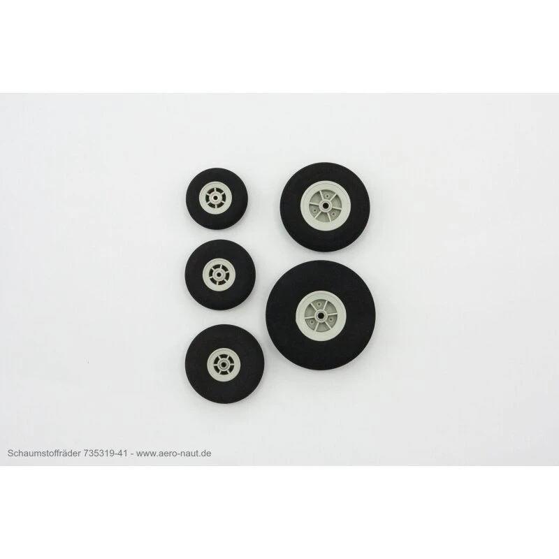 Superleicht-Schaumstoffräder mit Felgen aus leichtem, grauen Kunststoff. Reifen schwarz aufgeschäumt, weitgehend kraftstoffbeständig. Ø 20 mm, Breite ca. 5 mm, Achs-Bohrung 1.6 mm, Gewicht (Paar) ca. 1.6 g. VE = 2 Stück.