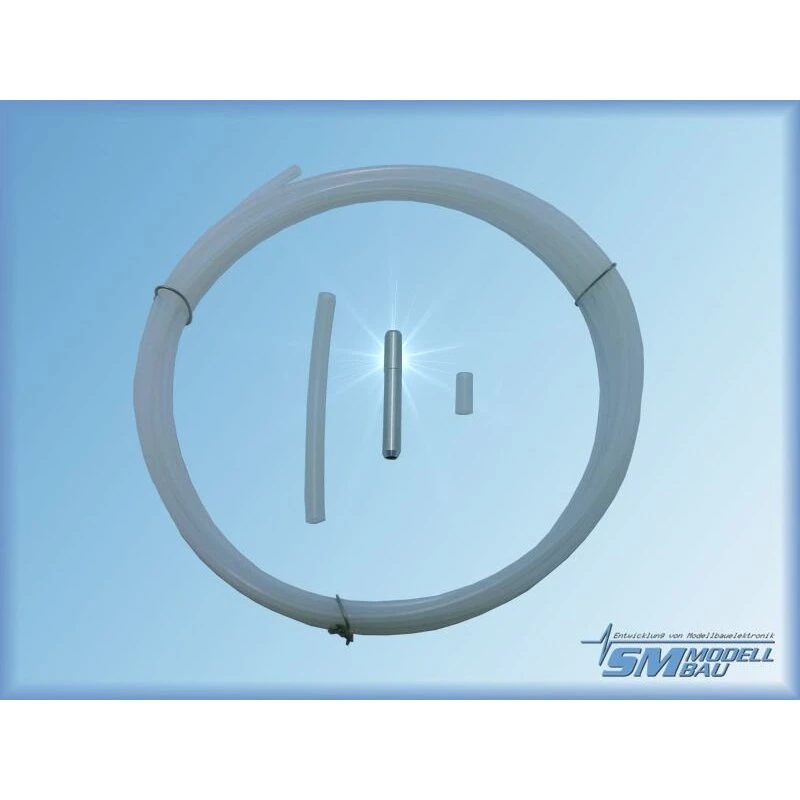 Der Teflonschlauch wird normalerweise einfach in die dünnere Seite der Düsenhalterung eingesteckt. Er klemmt dort und ist ausreichend dicht. Die Einstecktiefe beträgt 10 mm. Bei nachträglichem Einbau erspart man sich so die Probleme, den Schlauch nachträglich montieren zu müssen, weil er sonst nicht durch die Bohrung im Leitwerk passt.