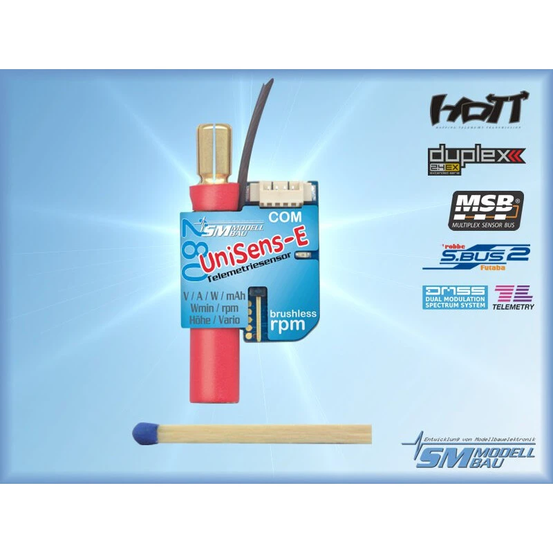 Der UniSens-E ist ein reiner Telemetriesensor speziell für alle Elektromodelle. Er ist so klein und leicht, gleichzeitig aber so leistungsfähig, dass er fast in jedem Modell eingesetzt werden kann.